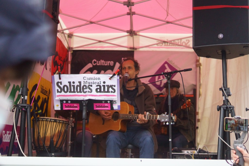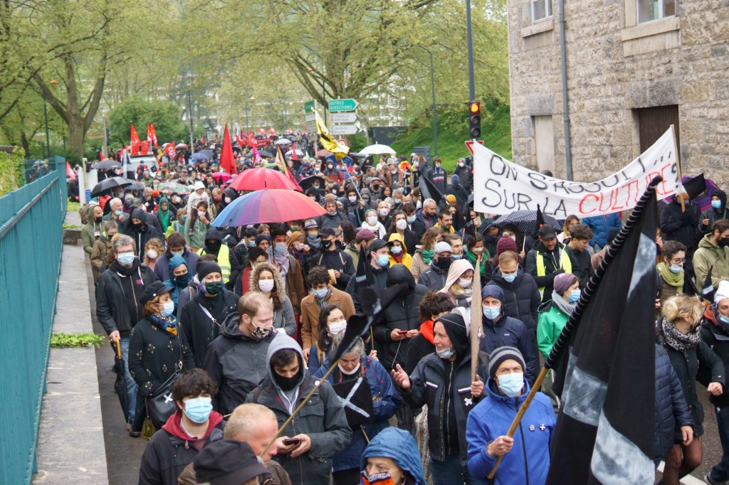 À l’appel de la CGT, FO, FSU, Solidaires et le CIP (Coordination des Intermittents et Précaires), 1.300 personnes (selon un compte de la CGT) ont marché à Besançon pour la fête des Travailleurs ce 1er mai. Le cortège est parti de la place de la révolution pour aller à la mairie, en passant par le CDN, occupé.