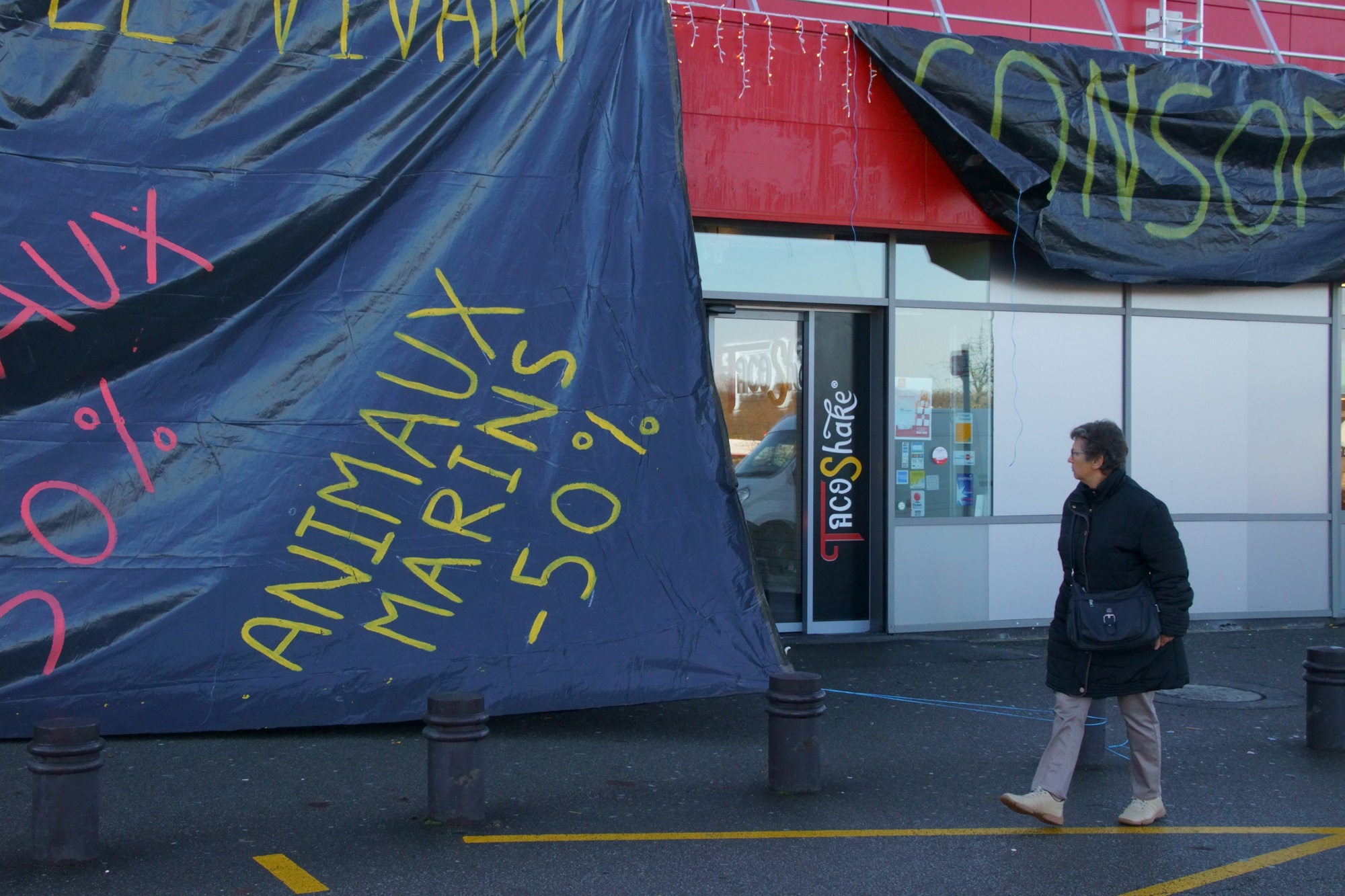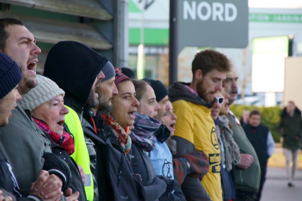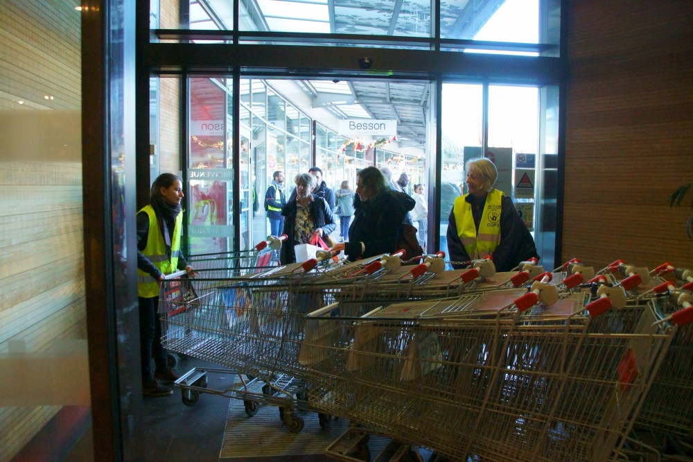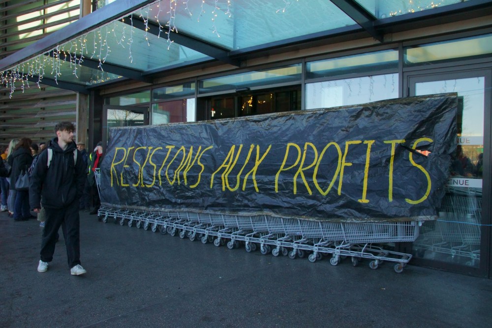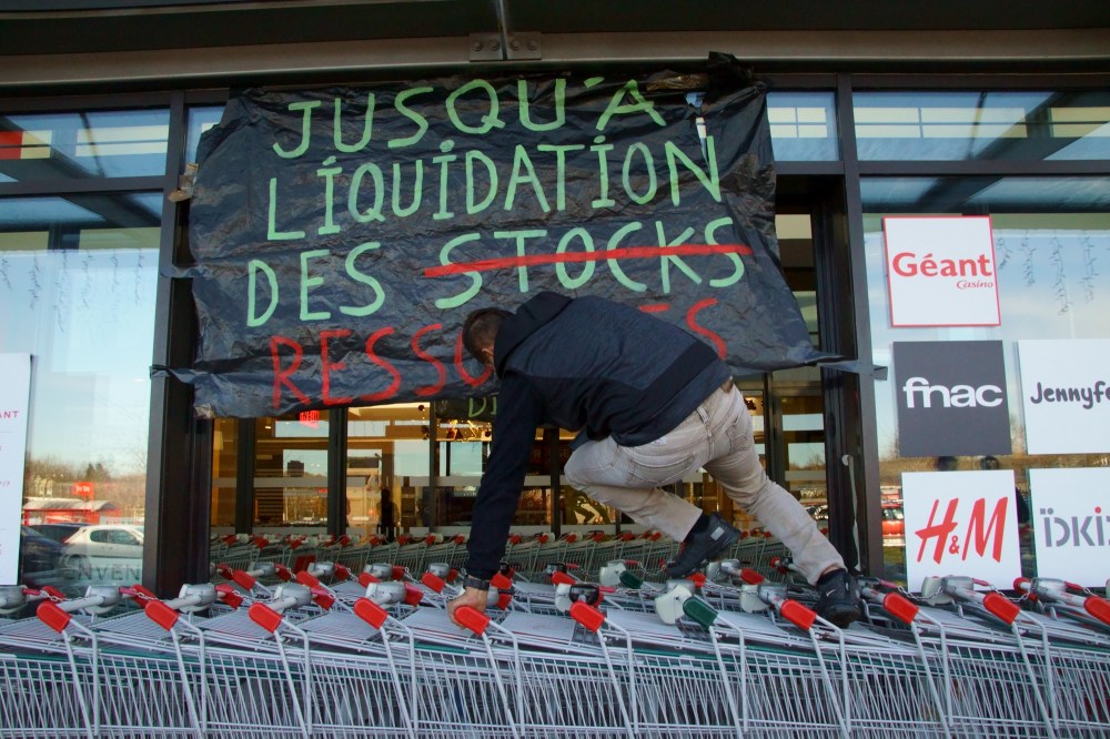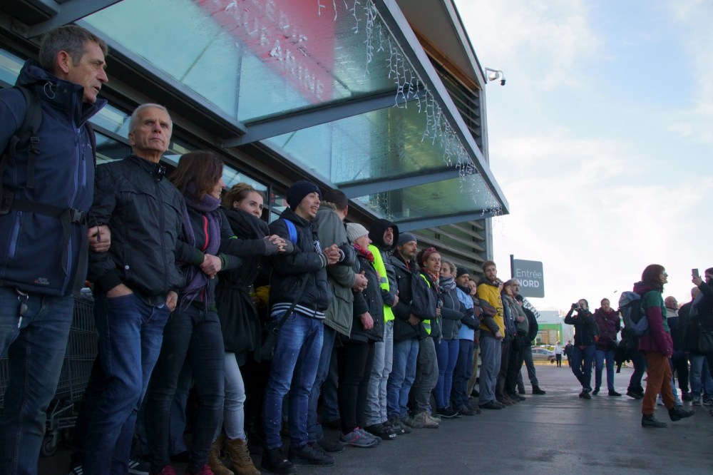 Les Organisations Non Gouvernementales Action Non Violente COP 21, Extinction Rébellion, Alternatiba, ATTAC et les gilets jaunes ont bloqué ensemble deux centres commerciaux à Besançon (25) samedi 30 novembre 2019 en réaction au Black Friday.